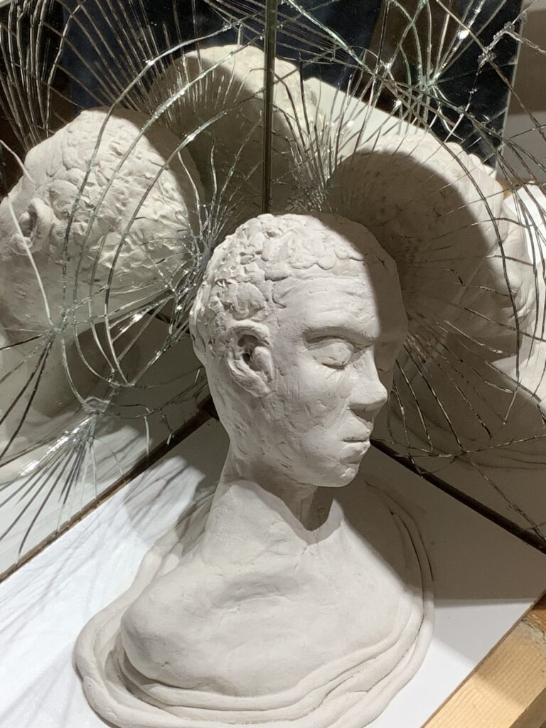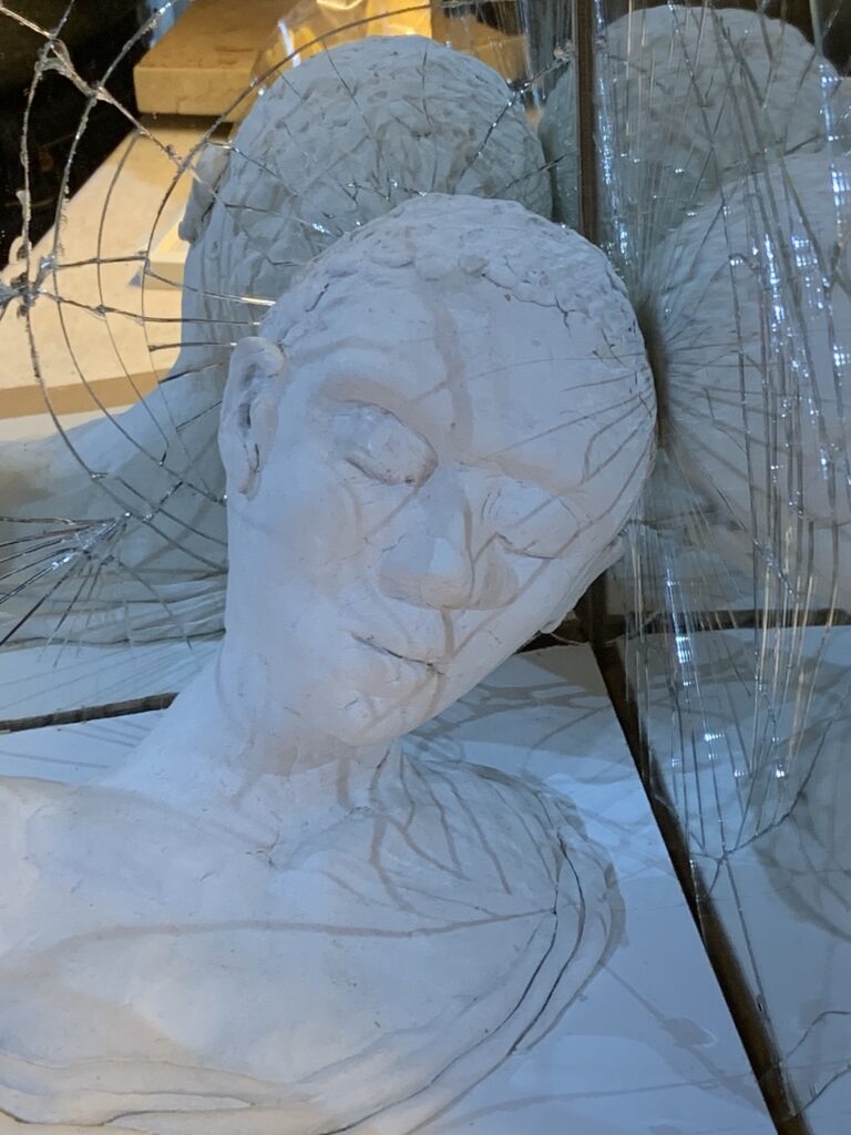 wire, clay, mirror, wooden panels (2024)